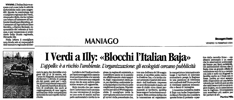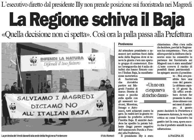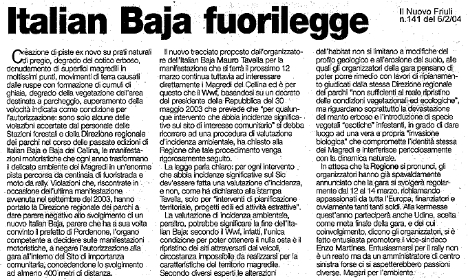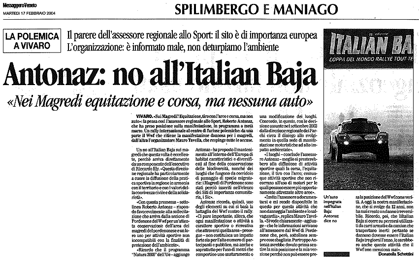 «L'Italian Baja e le altre manifestazioni motoristiche che hanno come teatro il territorio magredile, a cavallo tra i comuni di Cordenons e di Vivaro, non potranno più essere disputate, perché per ottenere le indispensabili autorizzazioni servirà la valutazione di incidenza ambientale che, però, non potrà essere rilasciata, in quanto l'unica condizione per poter ottenere tale nulla osta è il ripristino dei siti attraversati dai veicoli, circostanza impossibile da realizzarsi per le peculiarità fisiche ed ecosistemiche di quel territorio».