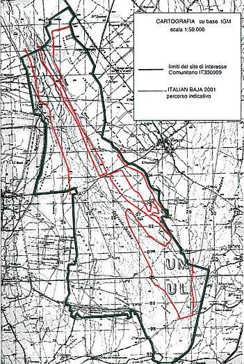 UNA PISTA IN UNA AREA PROTETTA?! Da questa cartina, che abbiamo ottenuto sovrapponendo il tracciato della pista (in rosso) con i confini dell'area SIC (area verde), è evidente che parte dell'enorme autodromo ricadeva nell'area protetta dalla normativa comunitaria. |