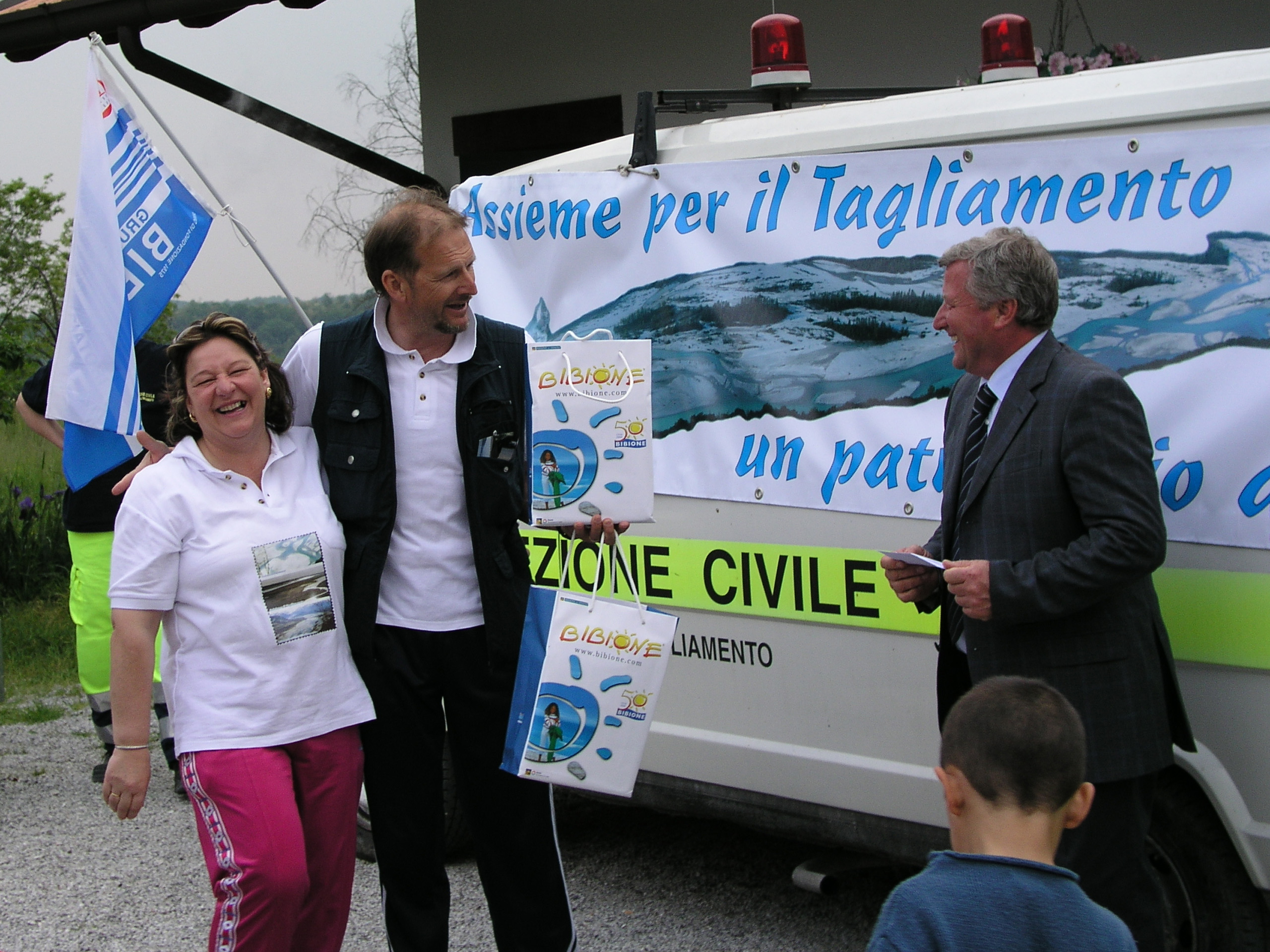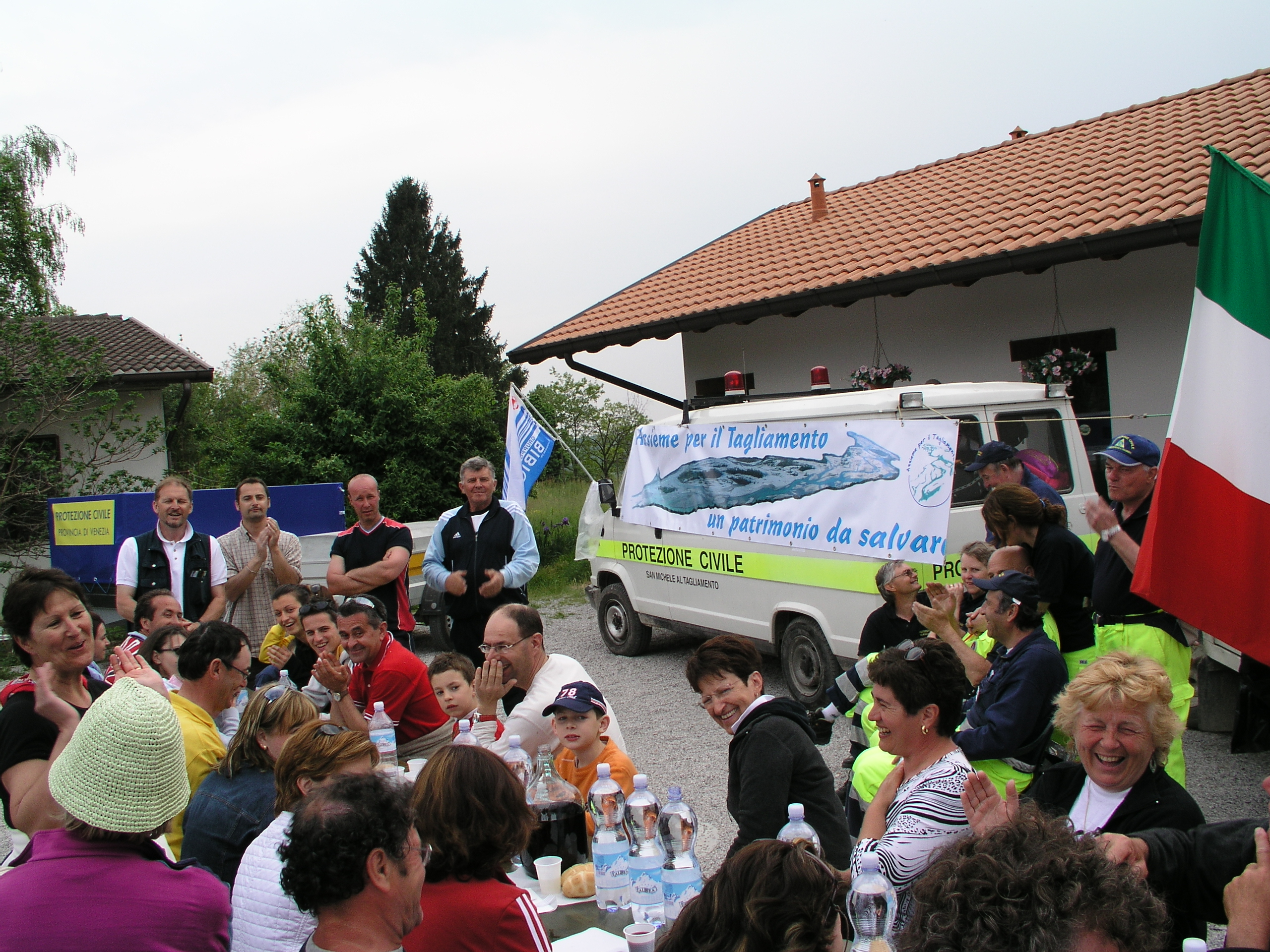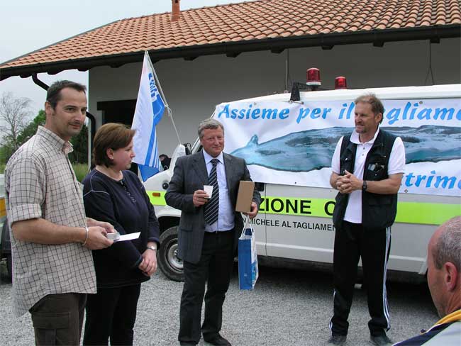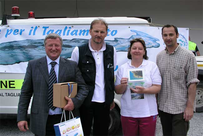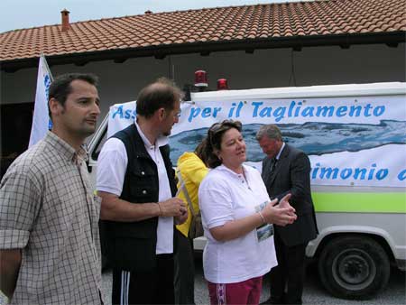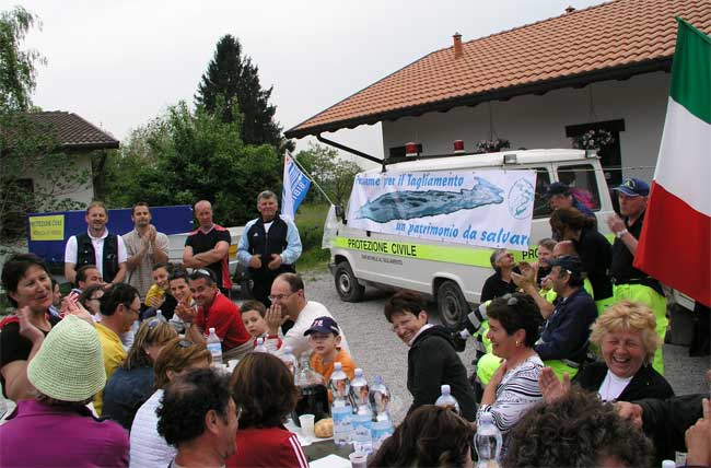l'idea che è subito piaciuta agli amici di San Michele e Bilione è stata riconosciuta solennemente con un rito simbolico avvenuto con una stretta di mano bagnata dalle acque del fiume Tagliamento fra il Vicesindaco di S. Michele Codognotto Lino e il presidente dell'Associazione Pradetto Franca. Il presidente inoltre ha colto l'occasione per invitare sin da subito i marciatori della bassa ad altre iniziative di sensibilizzazione in difesa del Tagliamento. Gli amici sono poi stati accompagnati fino in cima al colle di Ragogna e quando essi hanno potuto rendersi conto con i propri occhi dello spettacolo naturale che gli si presentava di fronte, a stento hanno creduto che proprio li si debbano realizzare le opere di cementificazione del fiume friulano. Tutto il gruppo si è poi spostato presso un agriturismo della zona per un breve momento di piacevole convivialità fra i marciatori, il sodalizio sorto in difesa del Tagliamento e il Sindaco di Pinzano. e proprio a quest'ultimi il Comune di San Michele ha voluto donare una targa ricordo con raffigurato il faro di bilione luogo di partenza della camminata intitolata gente di mare e gente di fiume alla foce del Tagliamento.