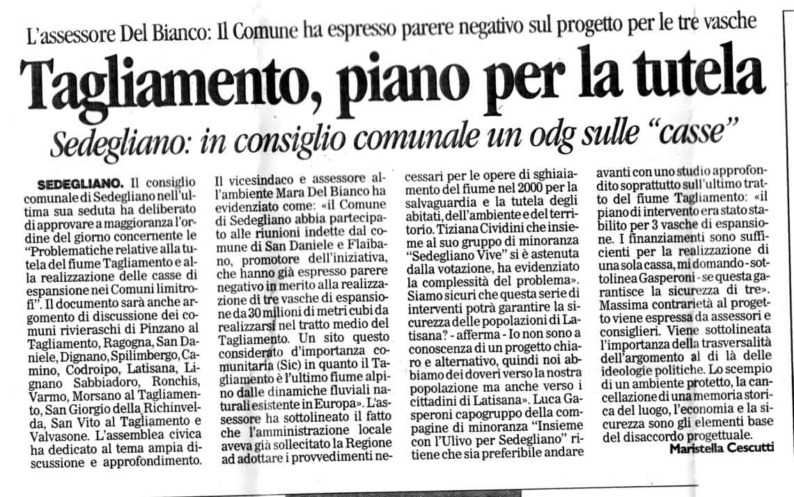 Nel maggio del 2002, il Consiglio provinciale udinese approvò un ordine del giorno nel quale si chiedeva espressamente, all'allora presidente della Giunta Regionale Renzo Tondo, di sospendere la scelta del progetto preliminare, rinforzando al contempo gli argini a Latisana, e lo invitava a promuovere progetti alternativi. Quel documento è rimasto lettera morta, ma a Trieste, dicono i malevoli, se ne sono comunque ricordati.