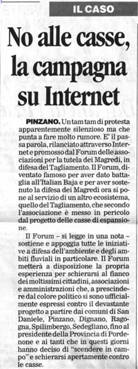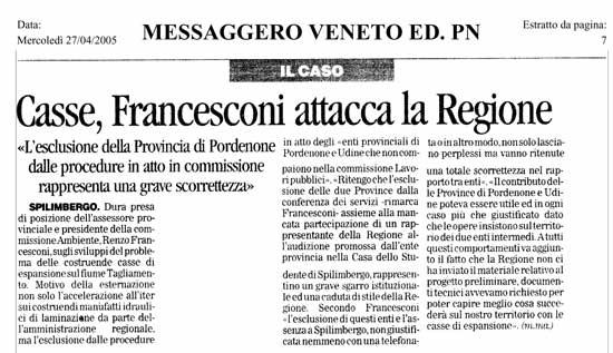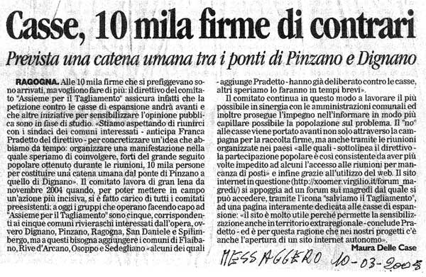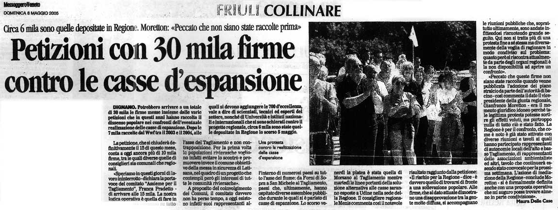 Trieste : La delibera 989 del 2004 della Giunta regionale, in merito alla costruzione delle casse di espansione sul fiume Tagliamento , vìola una specifica di rettiva comunitaria, in quanto l'assegnazione del progetto esecutivo è avvenuta senza la preventiva Valutazione d'impatto ambientale (Via). Inoltre, la costruzione è fortemente contrastata dalla popolazione che risiede nell'area interessata (Sito d'importanza comunitaria), perciò manca quel consenso sociale che il Piano Stralcio falsamente asseriva esserci. È quanto riportato nella petizione consegnata al presidente del Consiglio regionale, Alessandro Tesini, da una rappresentanza degli 11.907 citta di ni che l'hanno firmata assieme ai consiglieri regionali Franzil (Rifondazione), Tonutti e Menis (Margherita), Fortuna Drossi e Colussi (Citta di ni), Metz (Ver di ), Follegot (Lega). I Comuni interessati sono Di gnano, Pinzano al Tagliamento , Ragogna, San Daniele, Spilimbergo, Latisana.Dalla realizzazione delle casse d' espansione , così la petizione, potrebbe derivare una devastazione dell'ecosistema circostante, come affermato da numerosi esperti di ingegneria. Le opere, sostengono i firmatari, appaiono superate se si considera il fallimento delle precedenti esperienze fluviali europee (da ultimo il fiume Isaar di Monaco di Baviera, di cui è in corso il recupero).