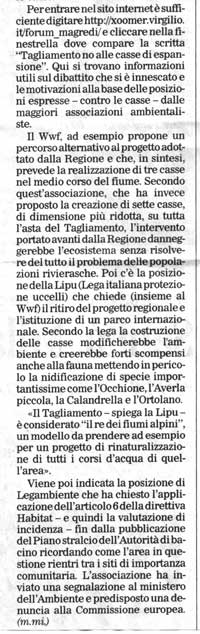 Si ammette poi, candidamente, che non ci sono denari per due delle tre casse, pure previste dal piano stralcio nel medio corso del Tagliamento in quanto " opere essenziali e risolutive per ridurre il rischio idraulico nel tratto di pianura del Tagliamento ". Delle due l'una: o il problema della sicurezza delle popolazioni rivierasche è sottostimato; oppure il piano stralcio non interpreta al meglio la realtà del territorio. Come Lei sa, proprio quest'ultimo punto emerge in tutta evidenza dallo studio WWF per l'individuazione di alternative alle casse di espansione previste dal piano dell'Autorità di Bacino. Forse anche per questo la Regione, che Lei rappresenta, ha dato incarico al "gruppo di lavoro interdirezionale" di esaminare gli impatti ambientali che deriverebbero dalla realizzazione delle opere nel medio corso.
