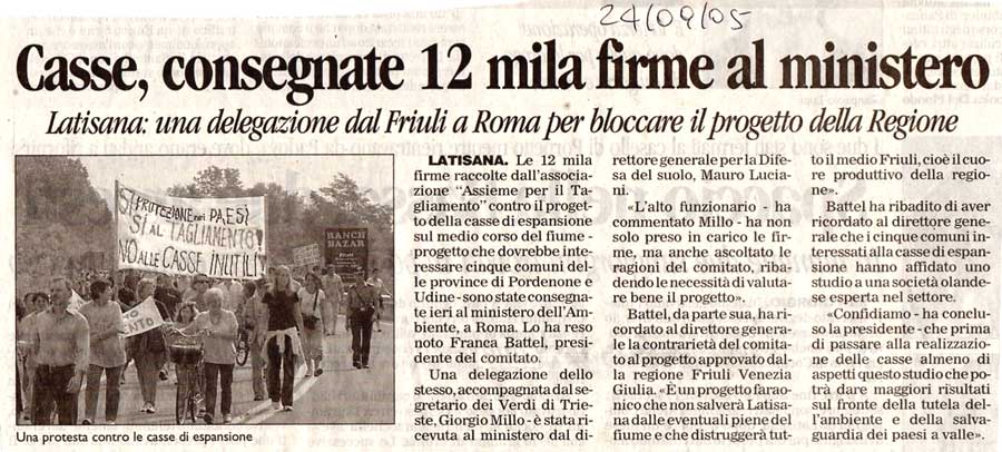 Trieste : La delibera 989 del 2004 della Giunta regionale, in merito alla costruzione delle casse di espansione sul fiume Tagliamento , vìola una specifica di rettiva comunitaria, in quanto l'assegnazione del progetto esecutivo è avvenuta senza la preventiva Valutazione d'impatto ambientale (Via). Inoltre, la costruzione è fortemente contrastata dalla popolazione che risiede nell'area interessata (Sito d'importanza comunitaria), perciò manca quel consenso sociale che il Piano Stralcio falsamente asseriva esserci. È quanto riportato nella petizione consegnata al presidente del Consiglio regionale, Alessandro Tesini, da una rappresentanza degli 11.907 citta di ni che l'hanno firmata assieme ai consiglieri regionali Franzil (Rifondazione), Tonutti e Menis (Margherita), Fortuna Drossi e Colussi (Citta di ni), Metz (Ver di ), Follegot (Lega). I Comuni interessati sono Di gnano, Pinzano al Tagliamento , Ragogna, San Daniele, Spilimbergo, Latisana.Dalla realizzazione delle casse d' espansione , così la petizione, potrebbe derivare una devastazione dell'ecosistema circostante, come affermato da numerosi esperti di ingegneria. Le opere, sostengono i firmatari, appaiono superate se si considera il fallimento delle precedenti esperienze fluviali europee (da ultimo il fiume Isaar di Monaco di Baviera, di cui è in corso il recupero).