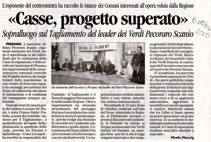 Incontro di Pecoraro Scanio con i sindaci sulle casse di espansioneDignano-Pinzano : Come preannunciato nei giorni scorsi sugli esiti degli incontri che la delegazione dell'associazione "Assieme per il Tagliamento" ha avuto negli ambienti del Ministero dell'Ambiente sul problema " casse di espansione ", il presidente nazionale dei Verdi, Alfonso Pecoraro Scanio, sarà oggi in Friuli. Alle 15, nella sala del Consiglio comunale di Pinzano incontrerà i sindaci, rappresentanti dei Comitati, Associazioni e semplici cittadini, per esprimere solidarietà a quanti stanno lavorando contro lo sperpero di denaro pubblico e la devastazione del Tagliamento e dei territori che lo circondano. Nella veste di parlamentare la sua presenza friulana si coniuga altresi con la richiesta del rispetto delle norme comunitarie, alla luce del fatto che la zona fra i ponti di Pinzano e Dignao, dove dovrebbero essere realizzate le casse di espansione , è considerato un Sic (Sito d'interesse comunitario). La delegazione di "Assieme per il Tagliamento" ha già fatto recapitare al Direttore Generale per la difesa del suolo presso il Ministero dell'Ambiente (Luciani), sia una petizione supportata da 12 mila firme sia una memoria scritta con la quale si chiede allo Stato d'intervenire al più presto nella parte di competenza, affinchè le leggi vengano rispettate. Sul fronte europeo, l'onorevole Danilo Bertoli, sta preparando un nuovo incontro con i Commissari italiani della Commissione Ambiente del Parlamento Europeo. Mentre a giorni è attesa sulla medesima materia la risposta sulla ripartizione delle competenze fra Stato e Regioni da parte di Pietro Armani, presidente della Commissione Lavori Pubblici ed Ambiente della Camera.