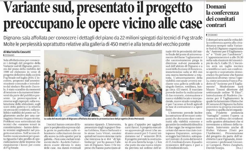 Nol covente jessi esperts par capî che, daûr dal professôr Campeol, il progjet de Variante Sud di Dignan si scugne tornâ a fâlu fûr par fûr. I comitâts che di agnorums si batin cuintri l'opare, a pensin che miôr di dut al sarès no fâle. Sono sperancis che la Regjon e torni su lis sôs decisions? Secont il professôr Campeol, sì: “Il podê corezi al è un trat tipic dai sistemis industriâi indevant”. E chi al à ce corezi. De bande sô, la conseire regjonâl Del Zovo e sta preparant une mozion di presentâ in consei. Intant comitâts popolârs a van indevant cul lôr lavôr di informazion: in curt a Dignan une assemblee popolâr dulà che i citadins a podaran viodi cui lôr voi, e cul jutori dai esperts, i progjet che si fevele e scoltâ lis critichis fatis de relazion Campeol, Zangheri, Scarpa.