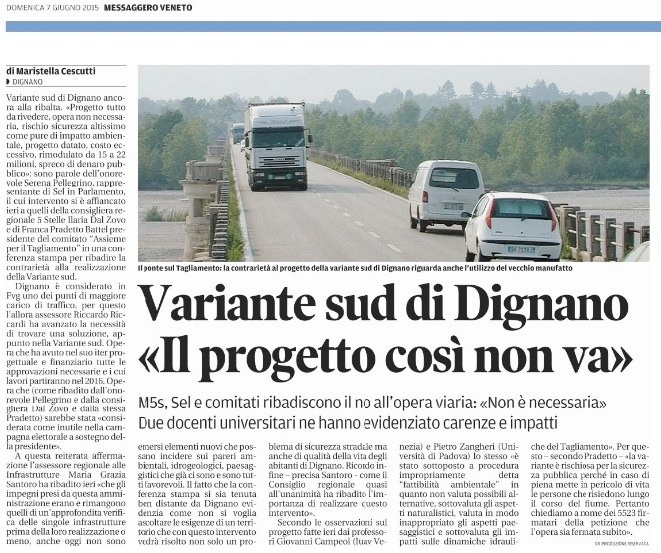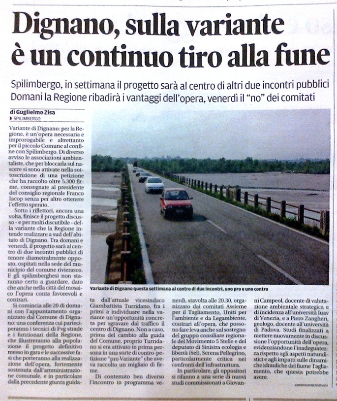 Campeol e Zangheri, con la collaborazione di Davide Scarpa, rispondendo ad una sollecitazione della deputata Serena Pellegrino, che è stata un’allieva del primo, hanno scritto un documento con le loro valutazioni che sono state presentate oggi al palazzo della Regione a Udine, presenti la stessa Pellegrino (Sel), la consigliera regionale Ilaria dal Zovo (M5S), Franca Pradetto, presidente dell’Associazione “Assieme per il Tagliamento”, Valter Vidusso, portavoce del comitato “Uniti per l’ambiente” di Dignano. Le conclusioni della relazione lasciano sbalorditi. “Il modello di valutazione preso – scrivono gli esperti – non è in grado di stimare se il progetto è compatibile con l’ambiente”. Conclusione, “bisognerebbe riaprire la procedura di Via con la presentazione di un nuovo studio di Impatto Ambientale”. In particolare, si aggiunge, si dovrà ripresentare il progetto definitivo, approfondendo almeno questi campi disciplinari … Intanto, serve “un modello di valutazione dei trasporti che si basi su di una analisi aggiornata delle correnti di traffico”. Poi, una analisi ed una valutazione del paesaggio realizzate secondo le linee guida del Dpcm 12.12.2005. Occorre, inoltre, l’elaborazione di un modello idraulico locale rapportato a larga scala, l’analisi approfondita delle caratteristiche biotiche locali. Per concludere, si dovrebbe perlomeno cercare alternative sia per ciò che riguarda la tipologia del progetto, sia per ciò che riguarda il sito. Cioè, non per nulla certo che la soluzione di una galleria di un chilometro passante sotto Dignano sia la soluzione migliore.