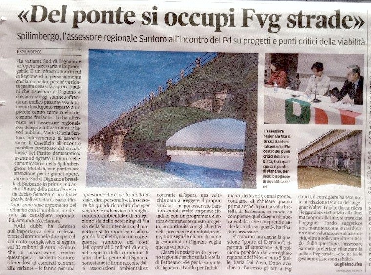 Cualchi sperance e jere nassude cuant che la neu presidente de Regjon Debora Serracchiani, tes sôs declarazions programatichis, e veve dit che al coventave tornâ a pensâ parsore a une schirie di oparis ideadis tancj agns indaûr, tra chestis la variant di Dignan. Tal Otubar dal an stât, però, la assessore Maria Grazia Santoro e à dât il so ben stâ ae opare fasint aprovâ la variazion di belanç che o vin dit sore. Zûcs za fats? I rapresentants dal Comitât no si rassegnin. Prossim pas, la presentazion di un ricors in Europe, magari a chel Ufici pes petizions de Comission europeane dulà che a vevin scrit agns indaûr propit par lamentâ la mancjance di une Via e che ur veve rispuindût di tornâ a fâsi sintî cuant che al fos stât fat bon il progjet definitîf.
